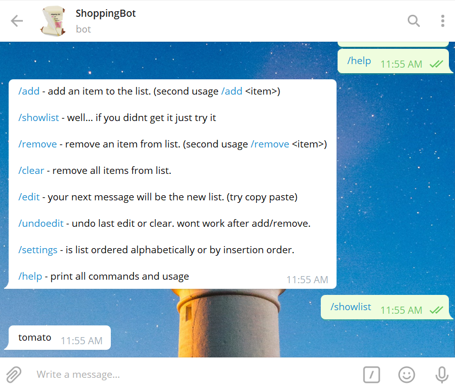 When the telegram bot API was published I wanted to check it out. I created a simple shopping list bot for me and my roommates. It was in the top 3 bots in the bot store for a while :)